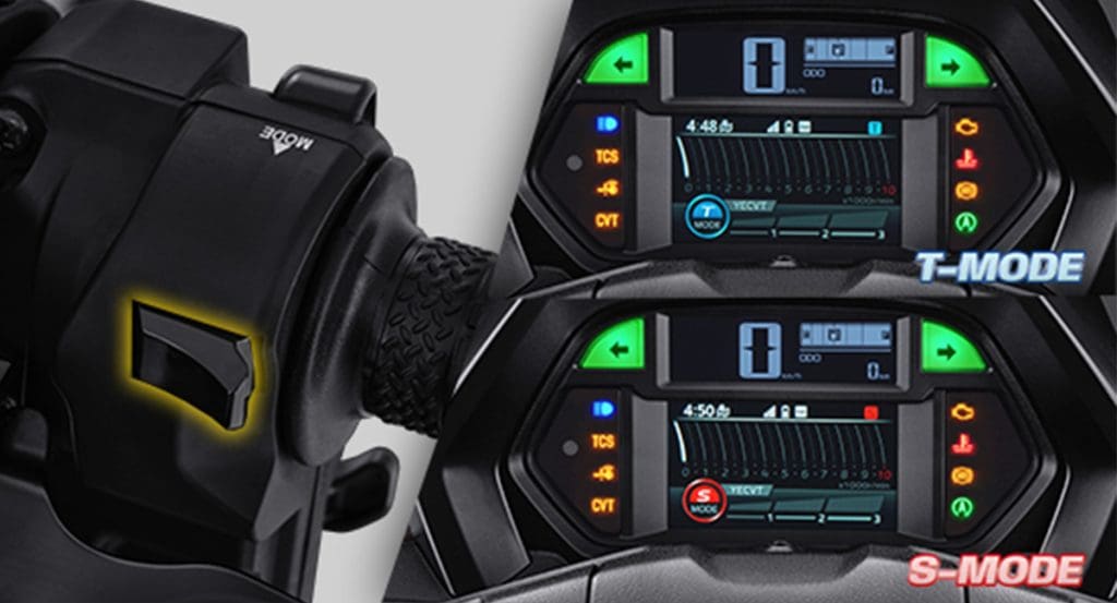 Performa mesin baru pada NMAX “TURBO” juga turut dioptimalkan dengan adanya teknologi canggih terbaru, yaitu YECVT* yang menggantikan sistem CVT konvensional. Dengan penggunaan teknologi ini, maka NMAX “TURBO” telah memiliki fitur Riding Mode* yang menawarkan 2 mode berkendara, yaitu T-Mode (Town Commuting) dan juga S-Mode (Sport Touring) yang dapat dioperasikan melalui tombol “Mode” pada bagian depan stang kemudi kiri. T-Mode sendiri cocok digunakan untuk mobilitas harian di dalam kota, karena karakter berkendara yang lebih smooth serta efisien bahan bakar. Sedangkan S-Mode, cocok digunakan saat perjalanan jarak jauh seperti touring karena menawarkan akselerasi berkendara yang lebih responsif.