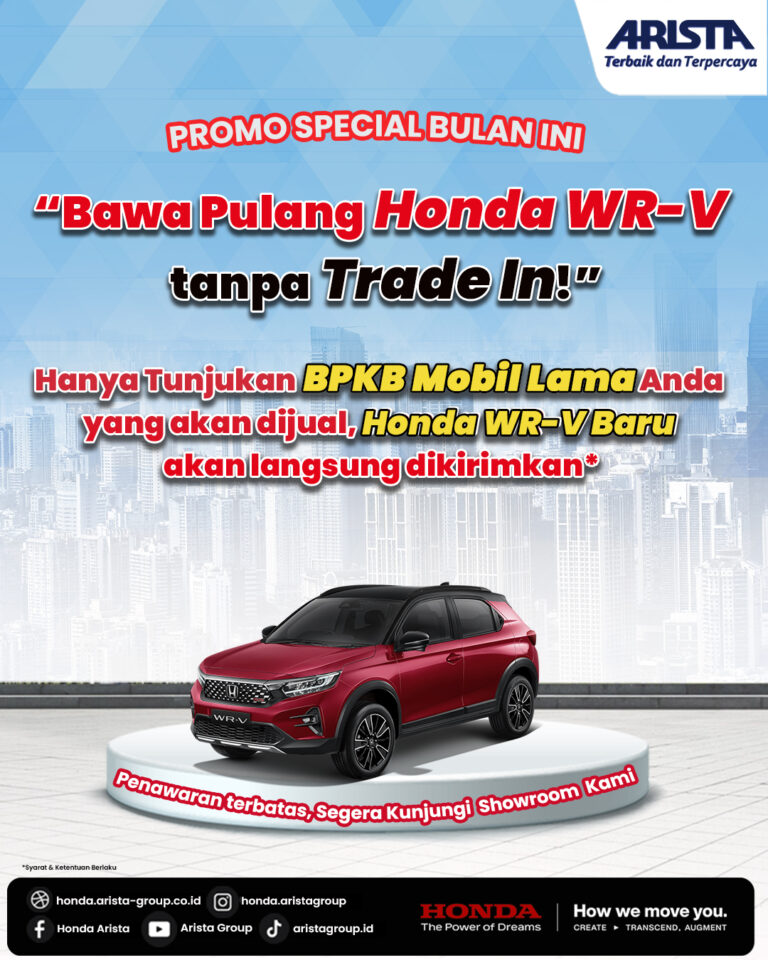 Gak perlu tukar tambah — cukup tunjukkan BPKB mobil lamamu, dan Honda WR-V baru siap langsung dikirim!✨ Plus, hasil penjualan mobil lamamu bisa langsung jadi dana tunai loh!
